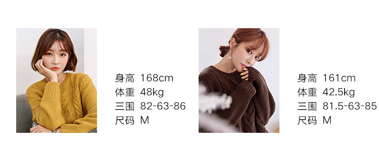 产品信息 货号 MY9718 尺码 S M L 颜色 咖啡色 黄色 成分 100%腈纶 季节 春季 秋季 冬季 面料弹性 无弹性 轻微弹性 高弹力 厚薄指数 厚款 厚薄适中 薄款 版型 紧身 修身 宽松 长度 短款 长度适中 长款 尺码说明 1. 肩宽(平铺后左肩端点到右肩端点的距离) 2. 胸围/2(平铺腋下直量) 3. 袖长(肩端点至袖口直量) 4. 前衣长(肩颈点至前下摆底端的垂直长度) 5. 后中长(后领中底部至下摆的垂直长度) 6. 下摆围/2(底摆左至右平量) 上衣尺码 肩宽 胸围 下摆围 衣长 袖长 袖口围 S 53 104 90 59 48 19 M 55 108 94 60 49 20 L 57 112 98 61 50 21 因手工测量方法和款式不同,存在1-3cm误差属合理范围