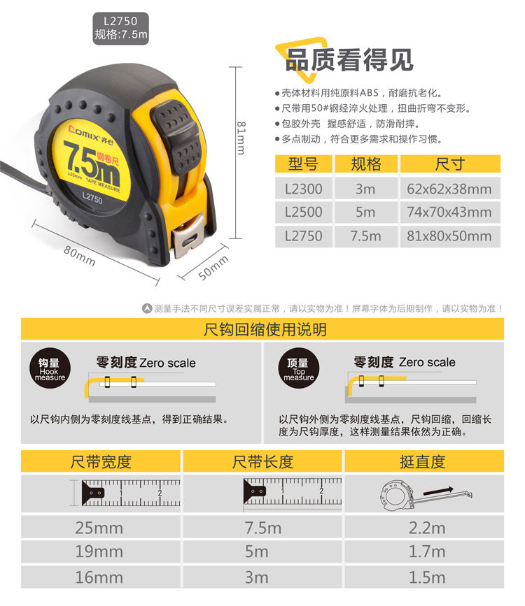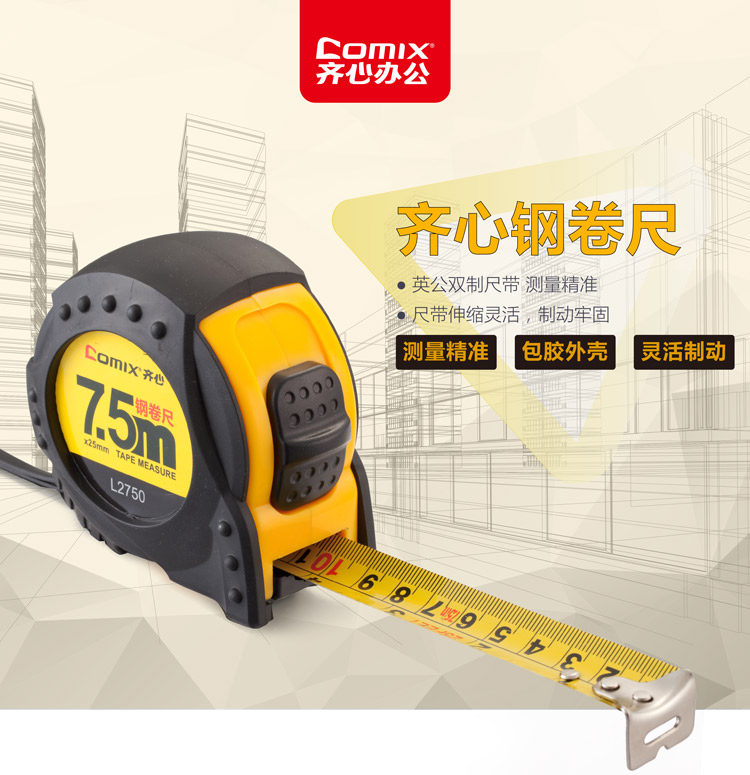 齐心L2750卷尺盒尺高精度不锈钢尺子木工钢卷尺7.5米超长测量尺